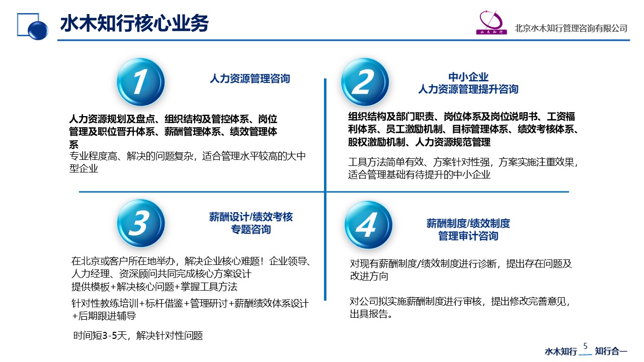 北京水木知行管理咨詢有限公司(www.bjsmzx_com.otohns.cn)專注提供人力資源管理咨詢、人力資源管理培訓、人力資源招聘咨詢、人力資源獵頭服務業務;咨詢業務范圍包括組織結構與管控體系、崗位管理體系、薪酬管理體系、績效管理體系,咨詢形式包括全過程咨詢、教練式咨詢和特訓班;培訓業務包括企業基礎管理...[詳情]